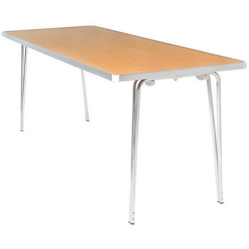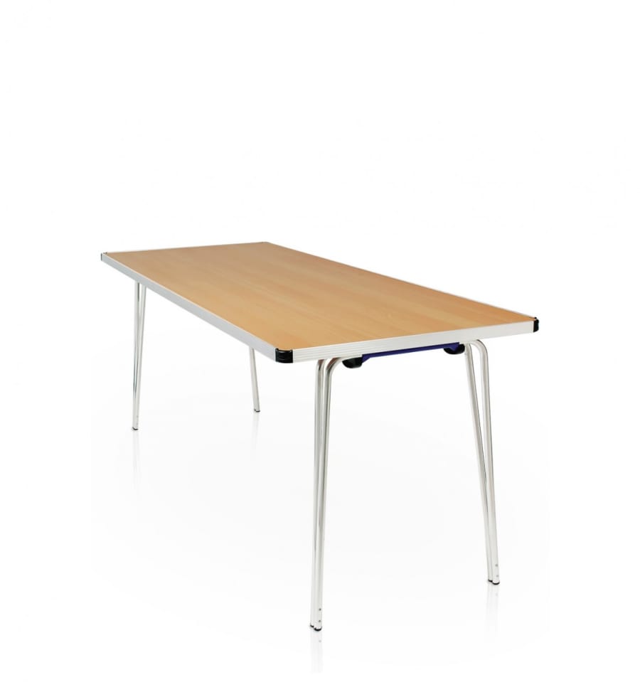 With its lightweight aluminium frame, this folding table is manufactured to the highest quality procedures. Light and portable weighs only 13kg and is 180 mm x 685 mm. The simple and fail-safe folding mechanism enables the table to be quickly and efficiently folded up and down with no pinch points, and the legs have been designed to fold back under the table in a controlled manner. Once folded the tables have a depth of 85mm so require very little storage space. Each corner of the table has solid plastic corners to protect the product from any unexpected impact and the rigours of daily use. Available in Durham Oak colour.