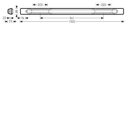 Optical system PMMA diffuser with inner prism structure. With symmetric wide light intensity distribution. Glare evaluation (EN 12464-1) according to UGR < 25. LED system Luminaire luminous flux 5700 lm, connected load 44,00 W, luminous efficiency of luminaire 130 lm/W. Light colour neutral white, correlated colour temperature (CCT) 4000 K, Colour locus tolerance (initial MacAdam) ≤ 3 SDCM, general colour rendering index (CRI) Ra > 80. Mean rated service life L80(tq 35 °C) = 50,000 h. Luminaire body Luminaire body of glass fibre-reinforced polyester. Colour of luminaire body light grey (RAL 7035). Dimensions (L x W): 1500 mm x 88 mm, luminaire height 77 mm. Permissible ambient temperature (ta): -30 °C - +35 °C. Electrical connection Rapid-mount luminaire with Wieland rapid plug system. 3-pole-version for switchable luminaires. Connection devices at both face ends implemented as socket or plug. Suitable connection socket and plug included in scope of supply.