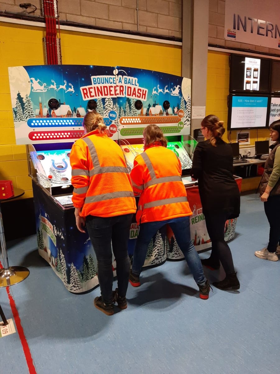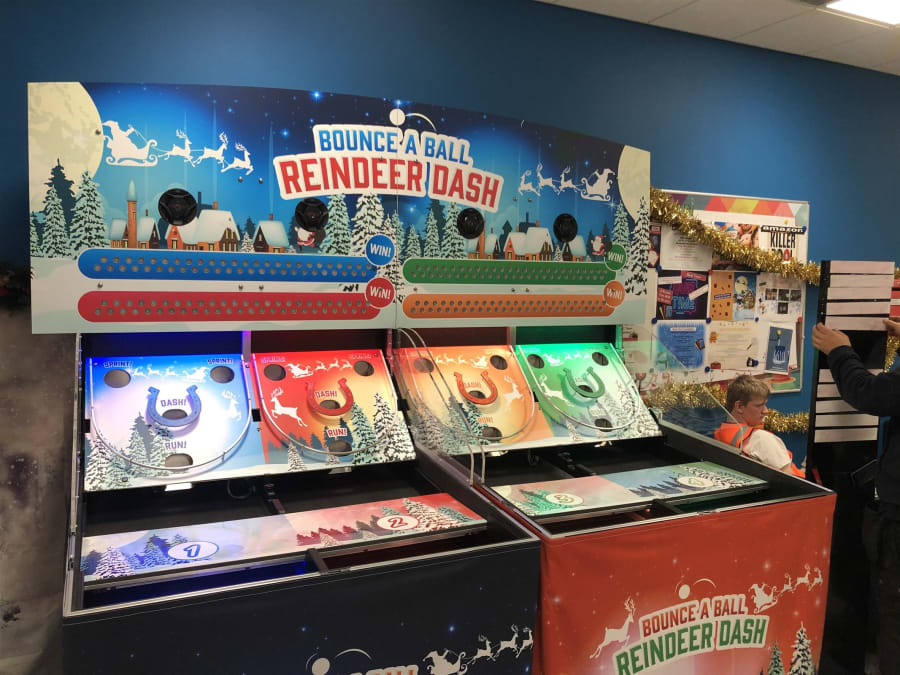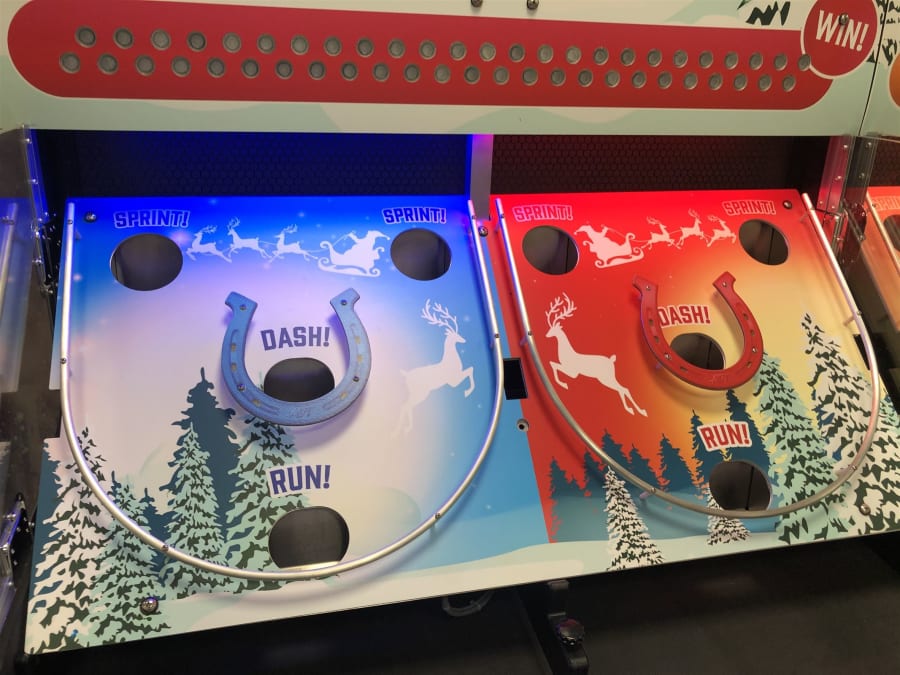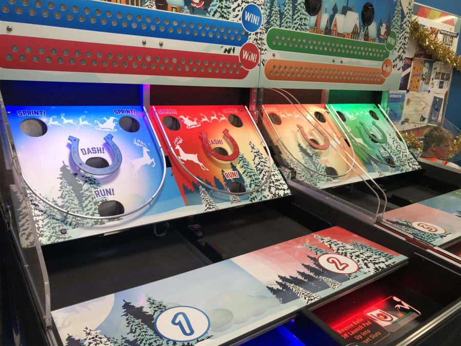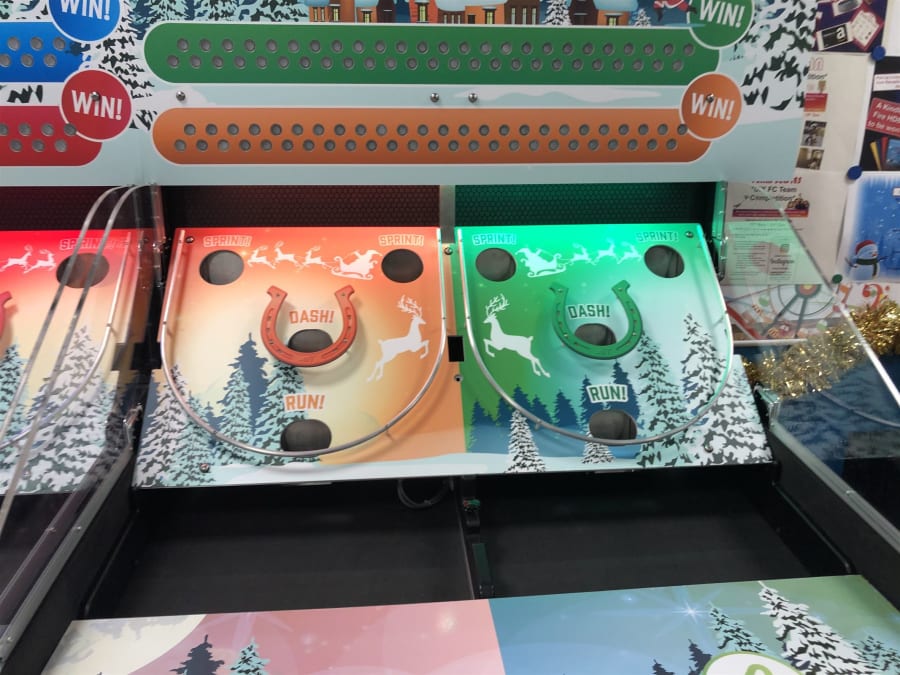 This games is a famous fair ground or holiday resort memory, Made from the original game donkey derby. the aim of the game requires requires the players to roll their balls up the field and through the coloured holes to score points, the more points they score the further their reindeer will be closer to victory.