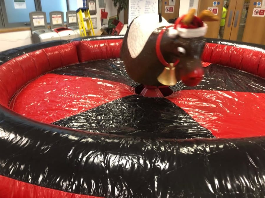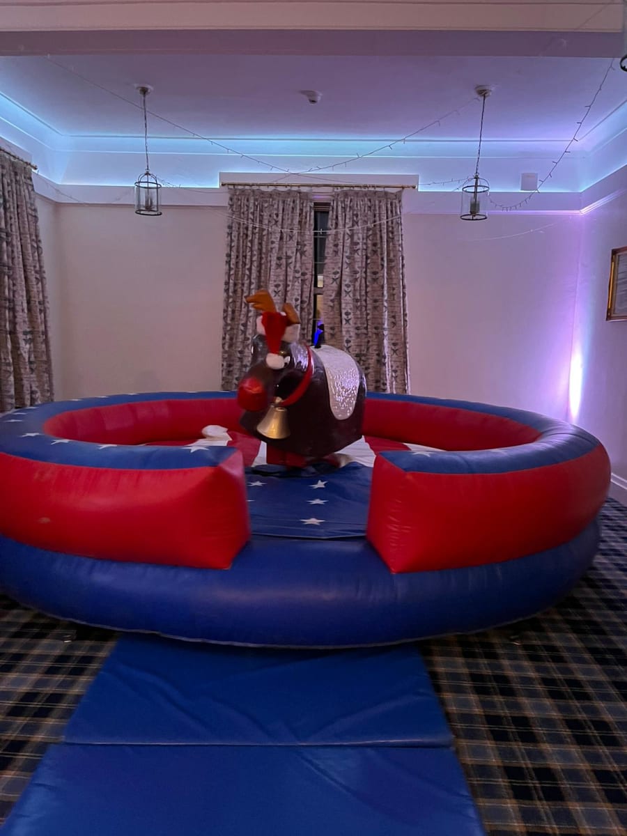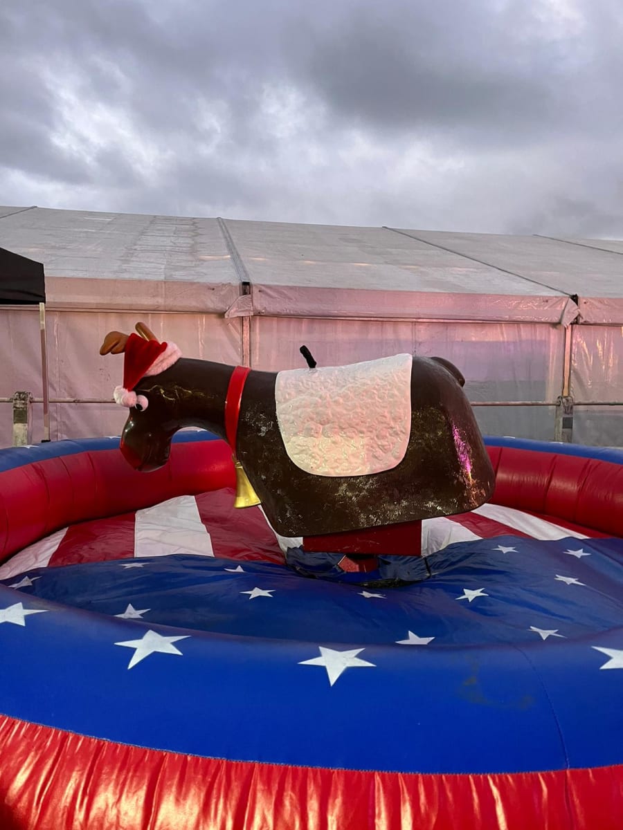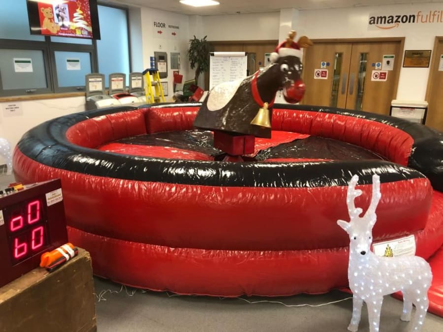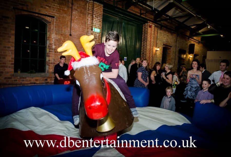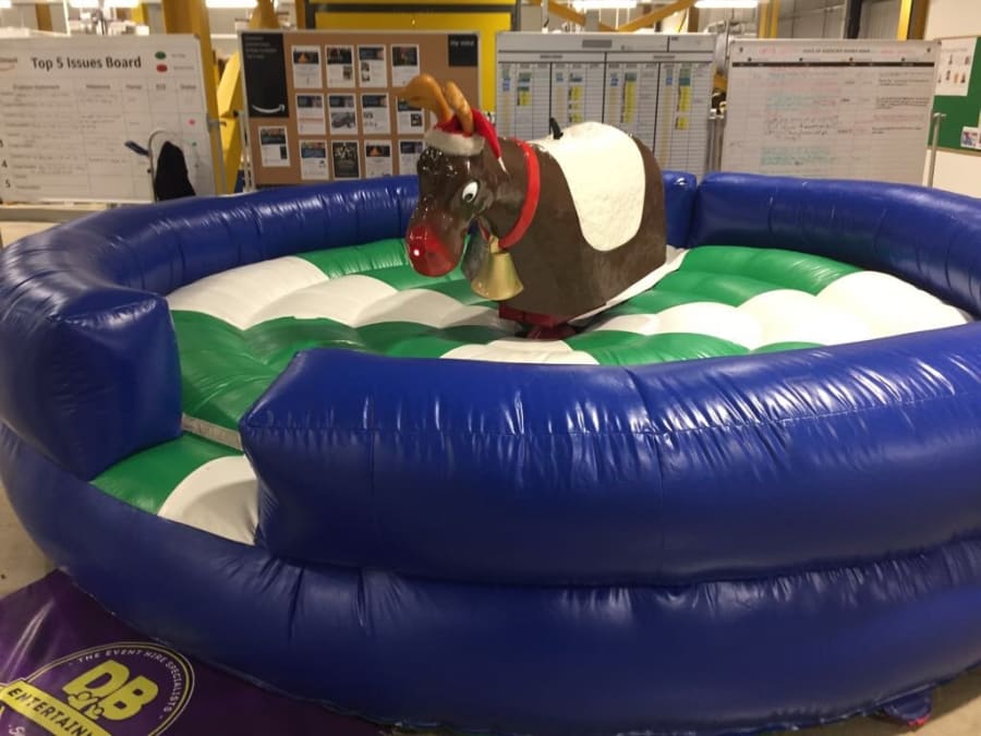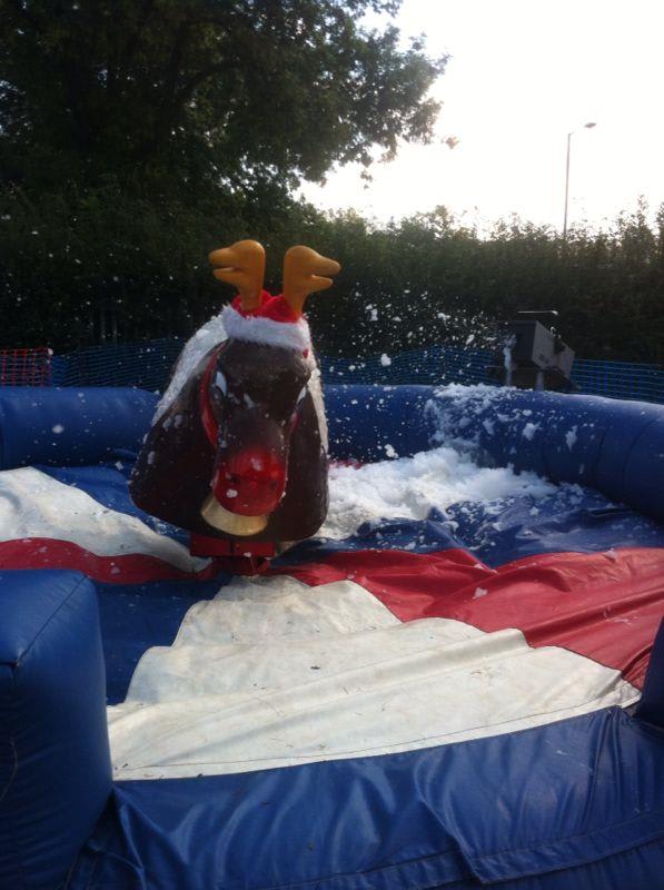 Based on a Rodeo Bull we bring the rodeo Reindeer which is a great attraction at any party. Our Rodeo Reindeers are perfect for office parties and Christmas parties. All ours come with our full experienced staff and come with a full digital timer so you can tell who’s the best Reindeer rider. We can even run competitions and give certificates out when requested. All Reindeers require access minimum of 3ft 3” and a setup clearance area of 16x16ft. The power requirements are 2 normal 13 amp plug sockets within 25m of the Rodeo reindeers location. We can provide a generator to power the bull at an additional cost of £85 (You can book this online by selecting the 6Kva generator with 4 hours fuel).