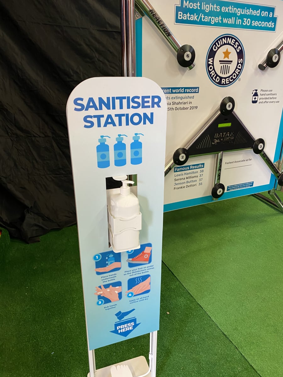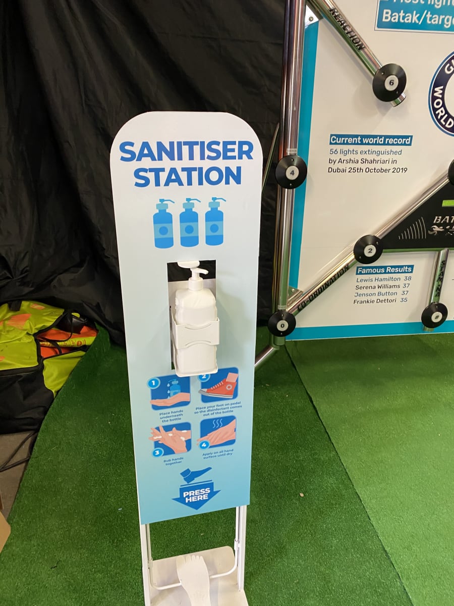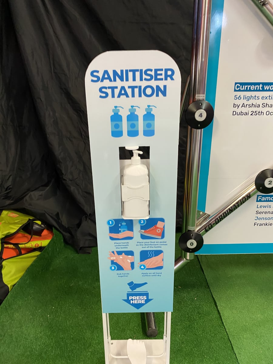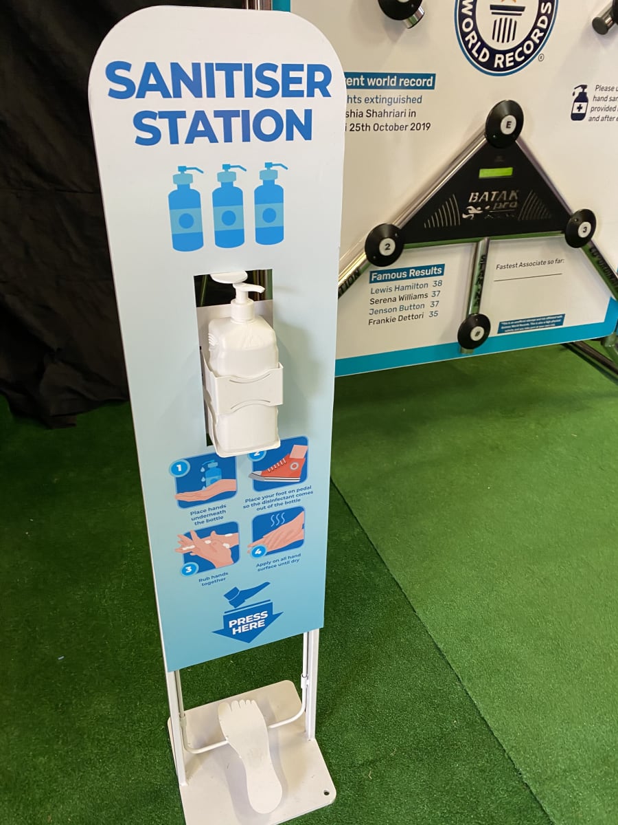 This is a foot operated hand sanitiser is 300mm (W) x 30mm (Thick) x 1200mm (H) Stand has a footprint of 400mm x 300mm