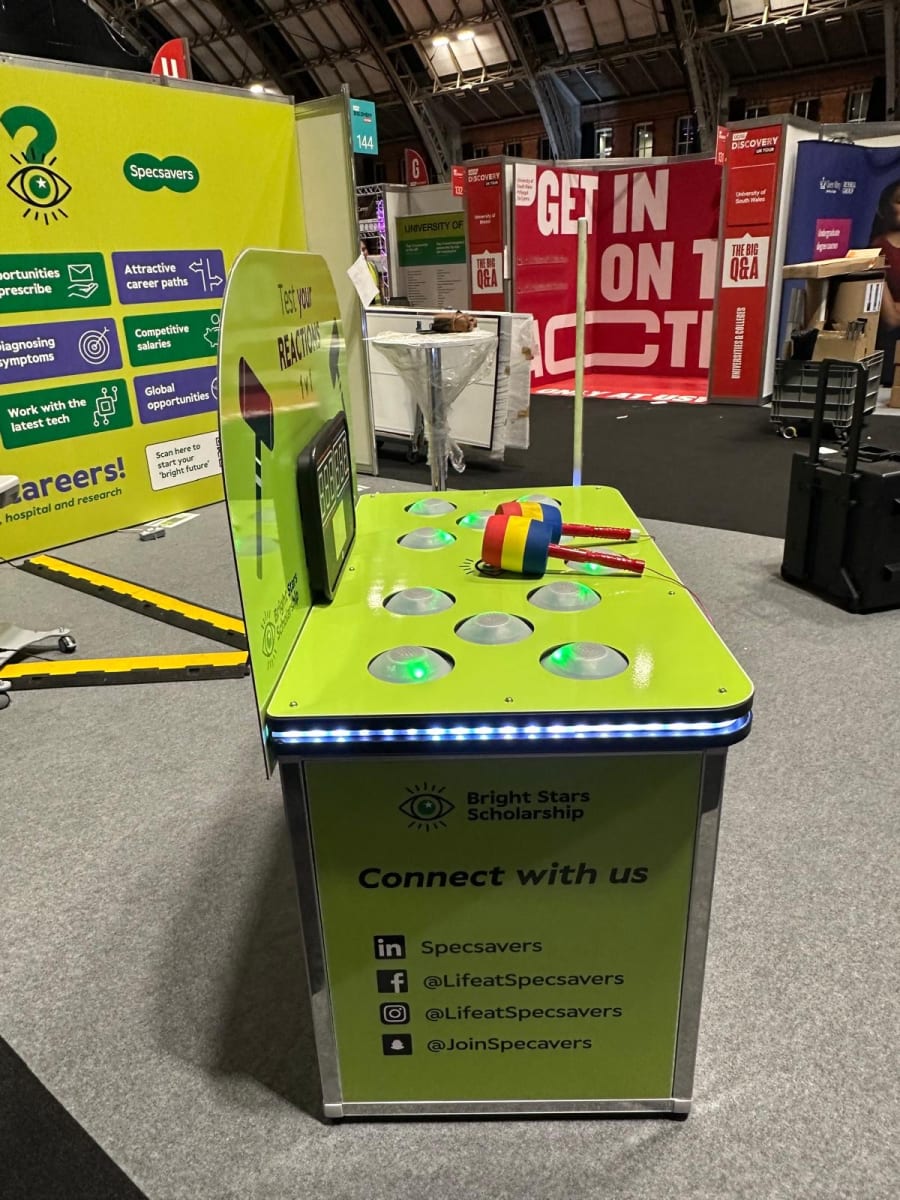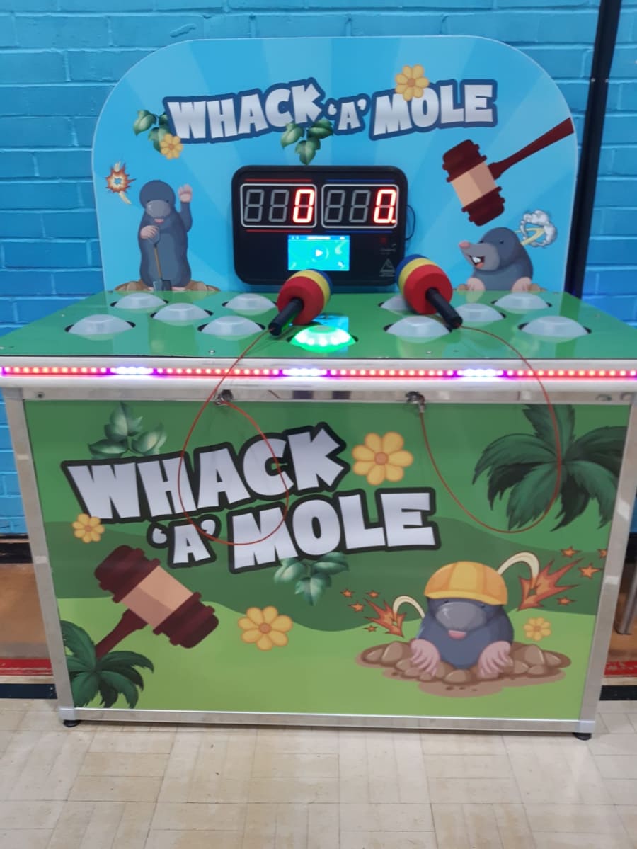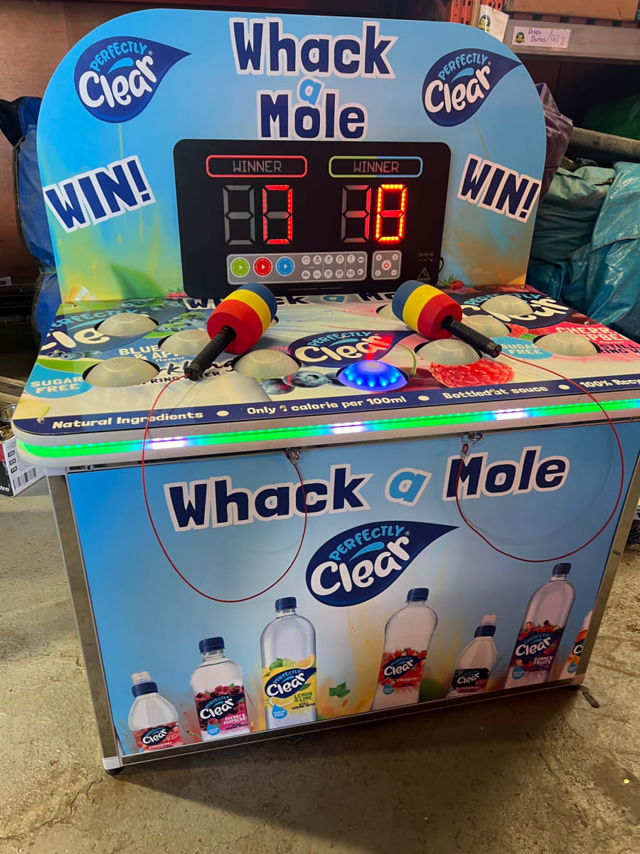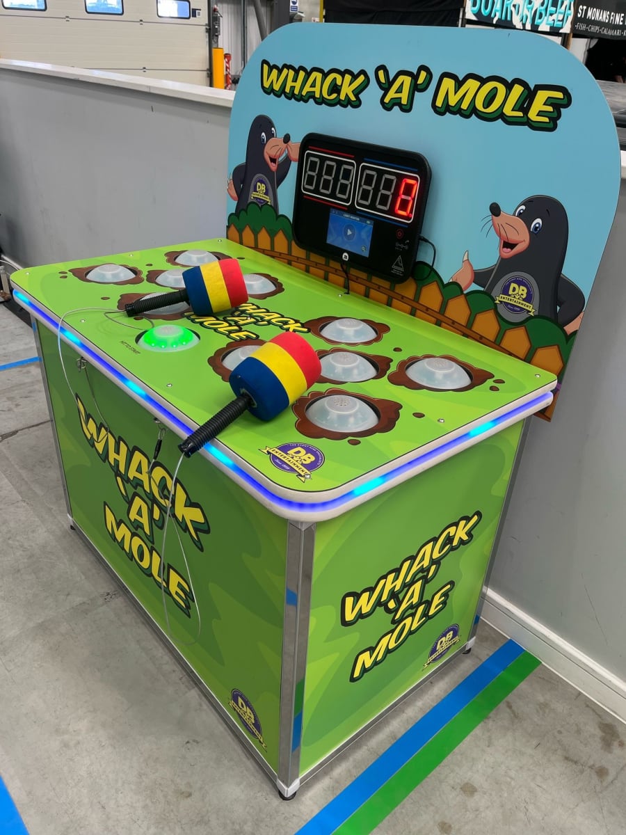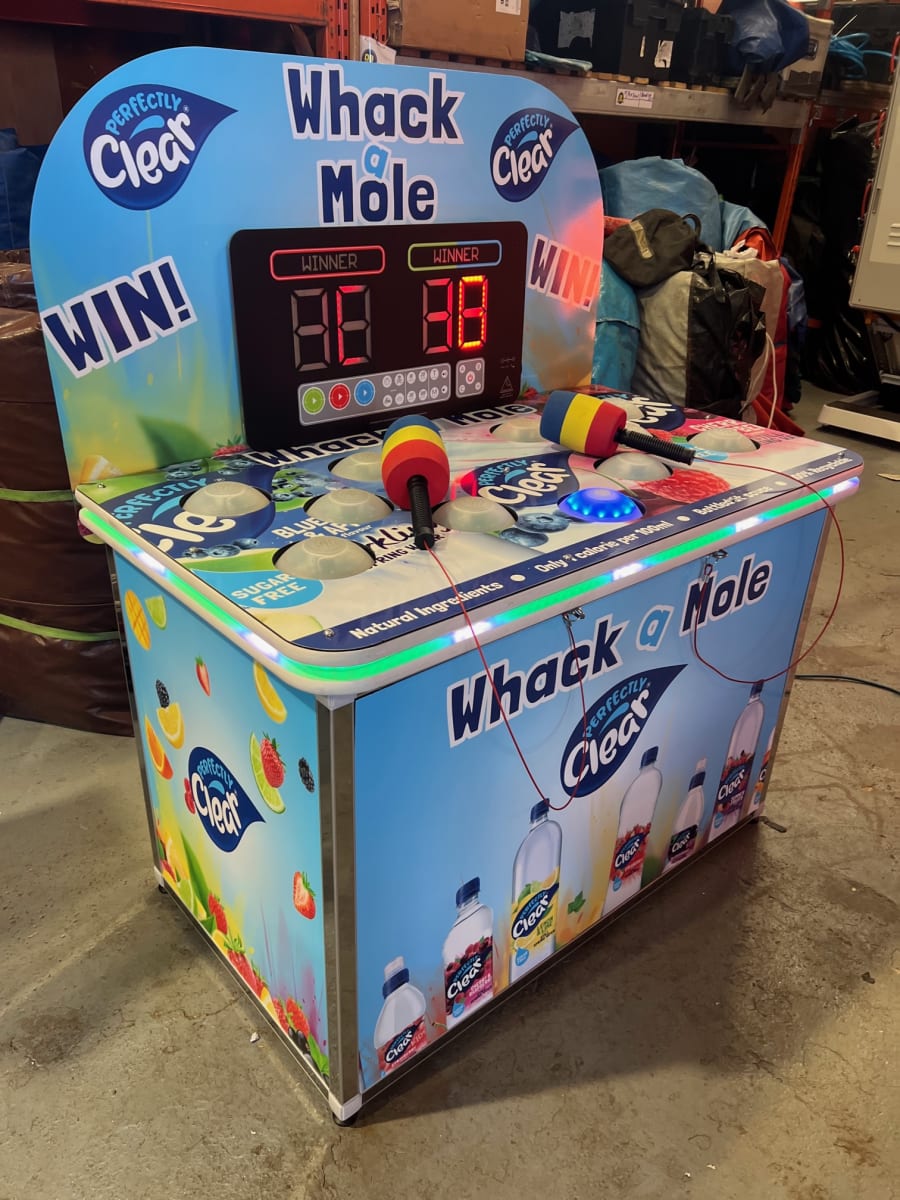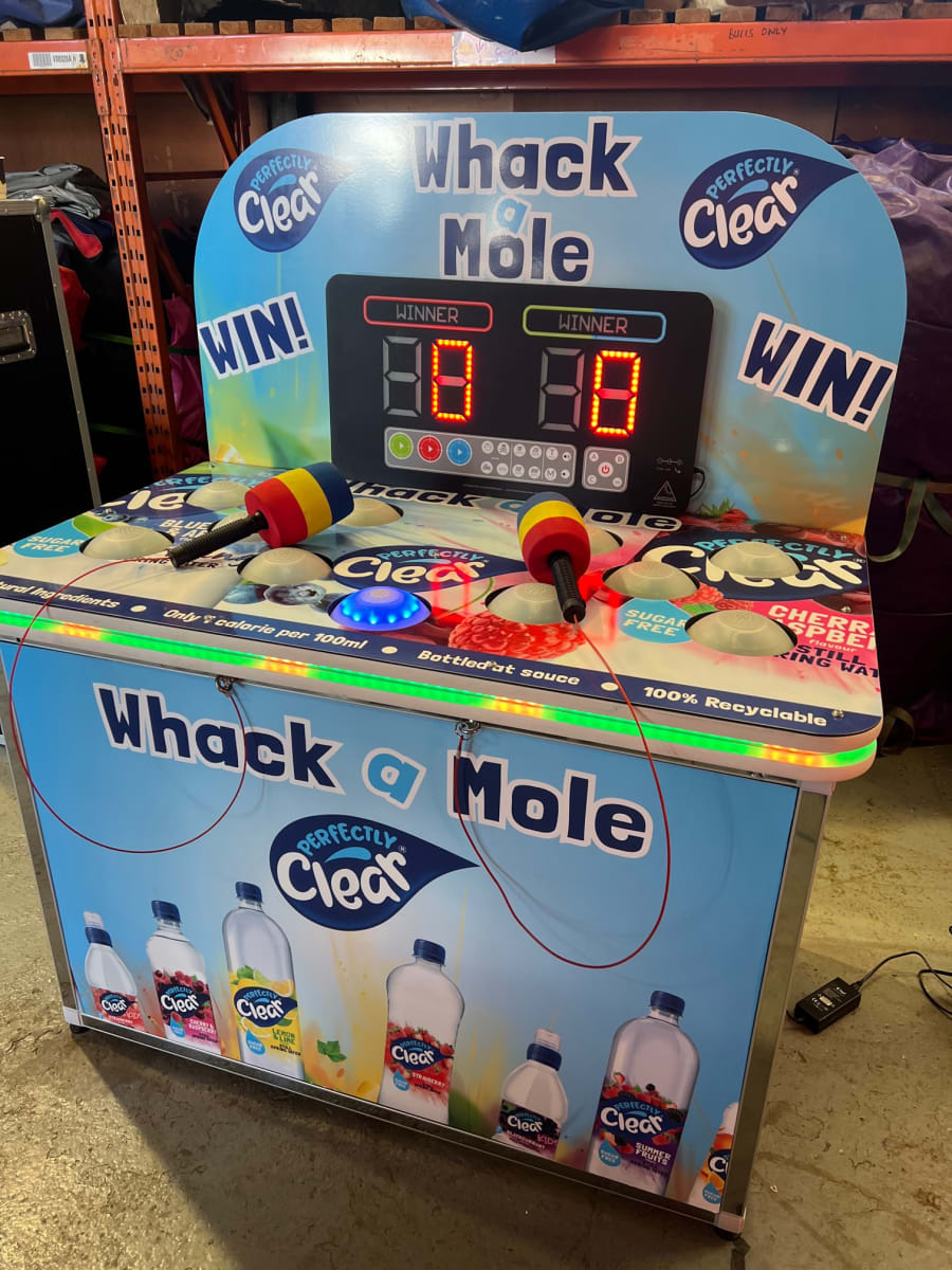 The Whack a Mole unit can be fully branded with your company logo, colours, campaign messaging, or product launch graphics. The front panel, side panels, and playing surface are all brandable. Check our gallery for examples of previous exhibition branding work. Everything is designed, printed, and applied by our in-house team – not outsourced.