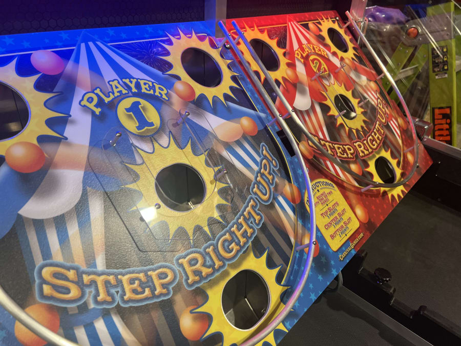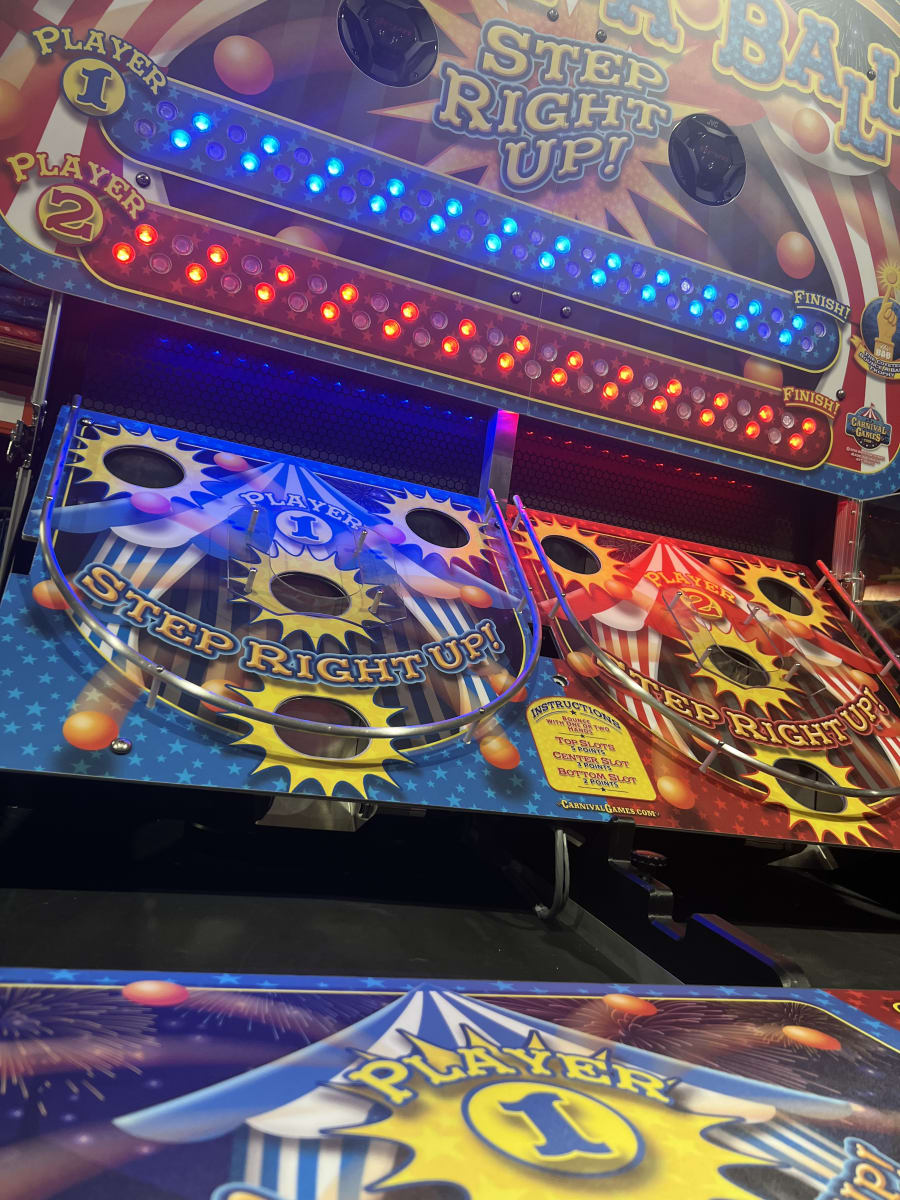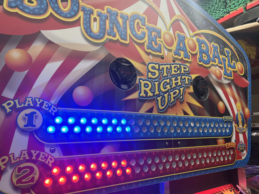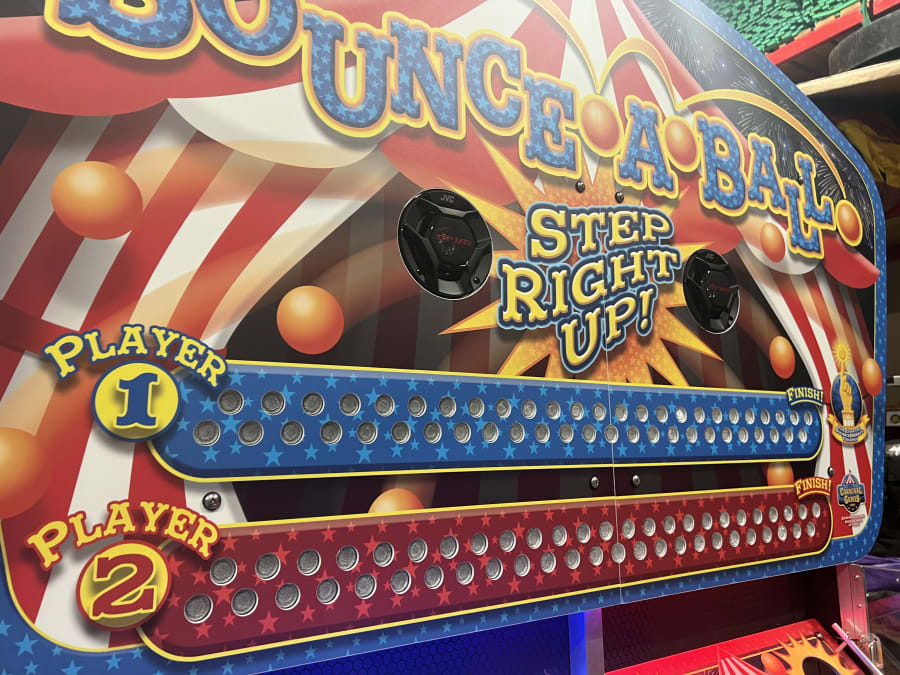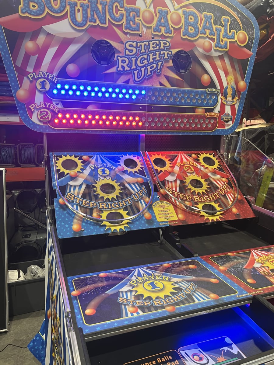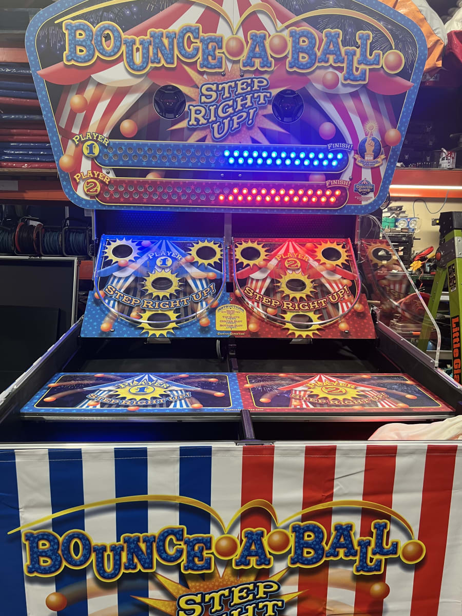 Introducing our Bounce-a-Ball. Like the roll-a-ball derby, this new, modern alternative adds more skill and interaction by bouncing the ball to get your ball through the various target holes.
