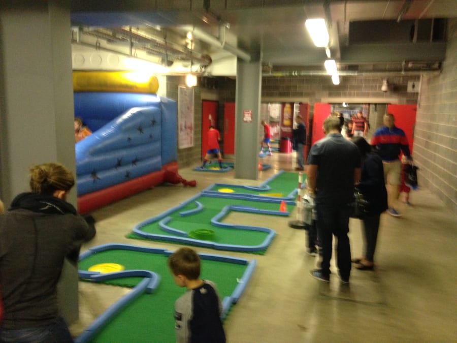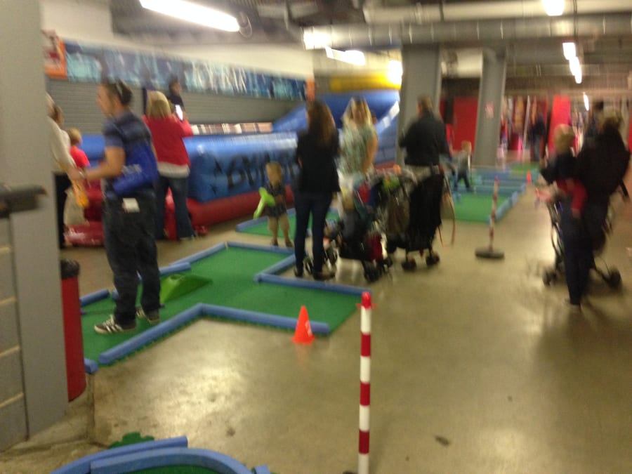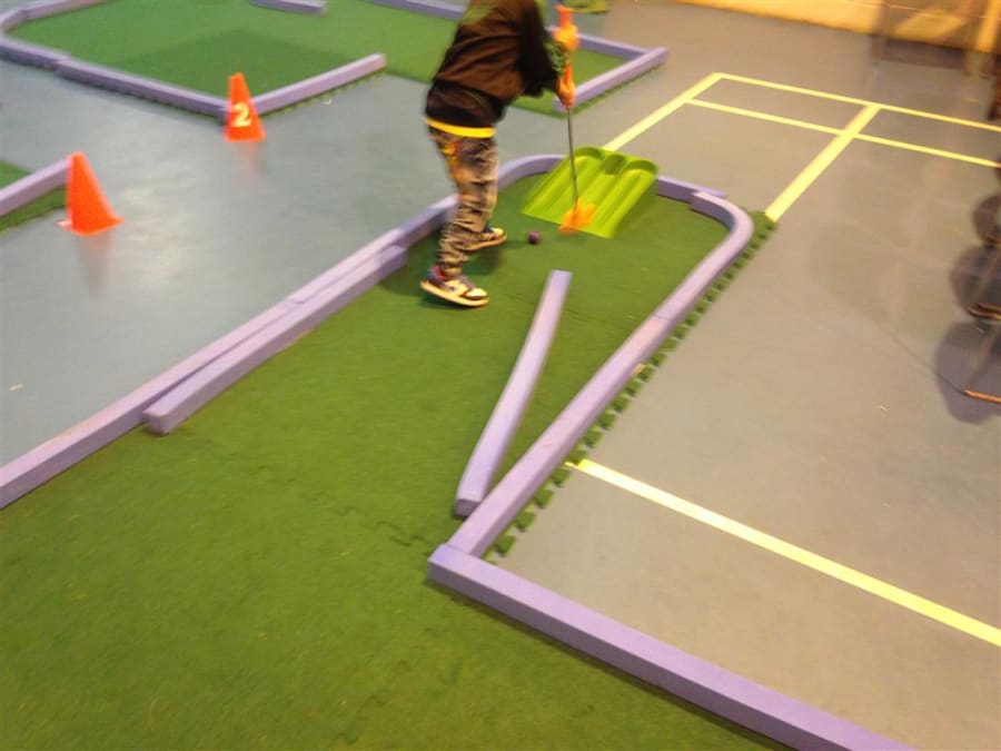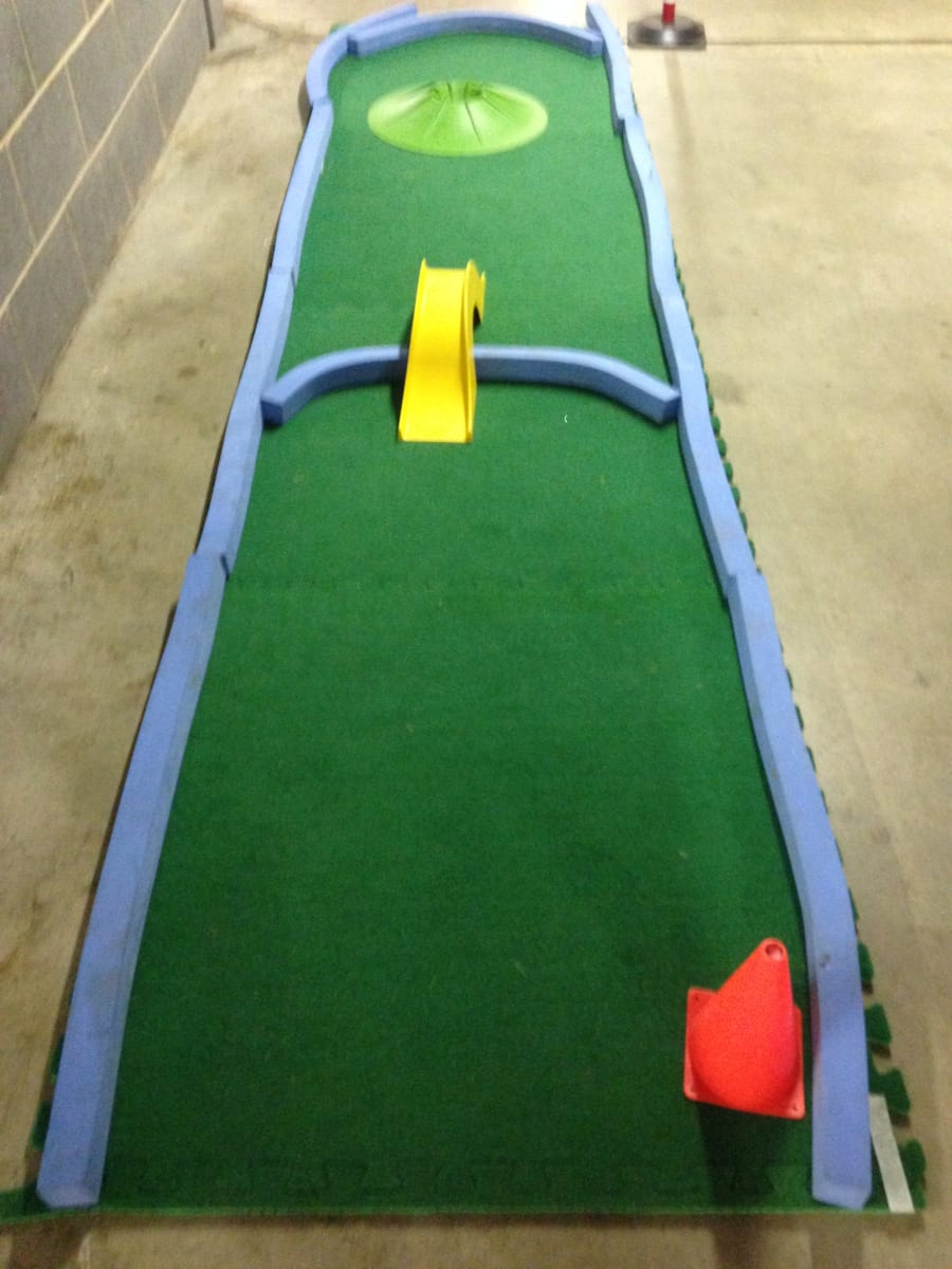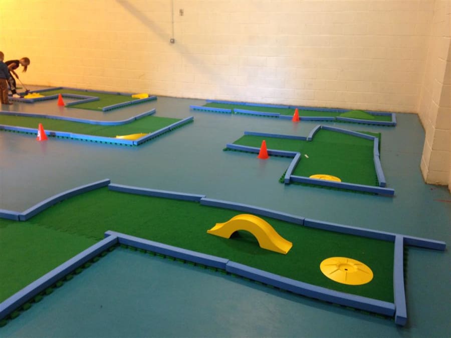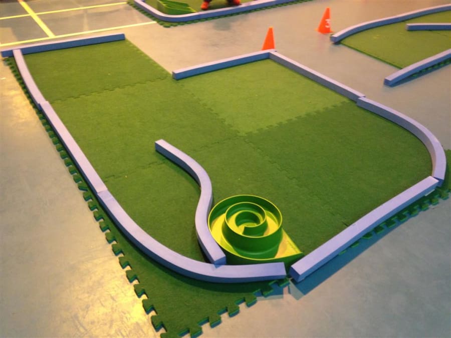 The surface has a non-slip backing and can be used on any flooring safely. Being a rubber backed material, the course may be placed anywhere and will not damage the floor. Use safely on gym floors, hall floors, etc. Use our crazy golf courses outside on grass, playgrounds or tarmac and indoors on any flooring.