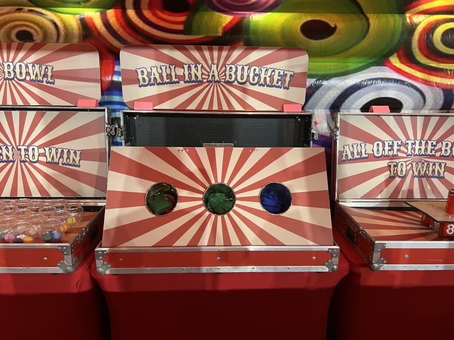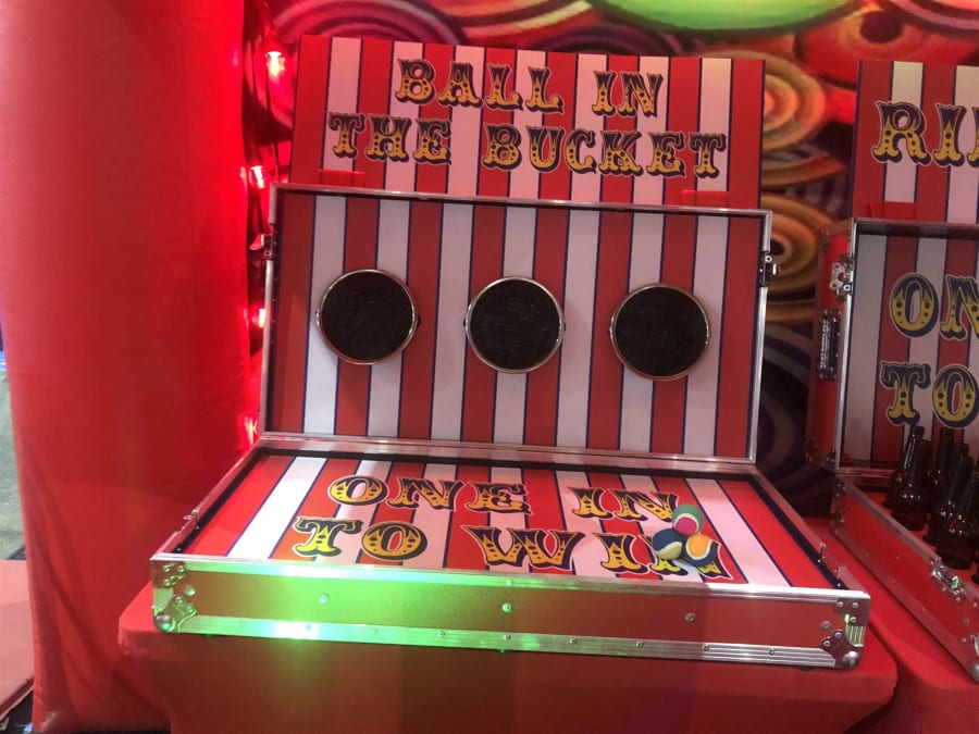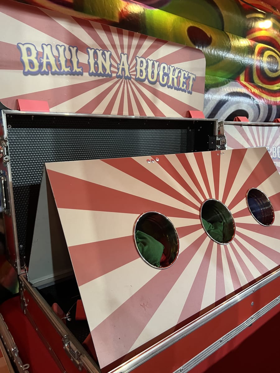 Ball-in-a-bucket - What looks like the easiest game is possibly the hardest and most frustrating! A fairground classic ball in a bucket is a real test of skill. Can you throw the ball and get it to stay in one of the three buckets without it rolling out? If you succeed, there is a team member inside to give you a prize!