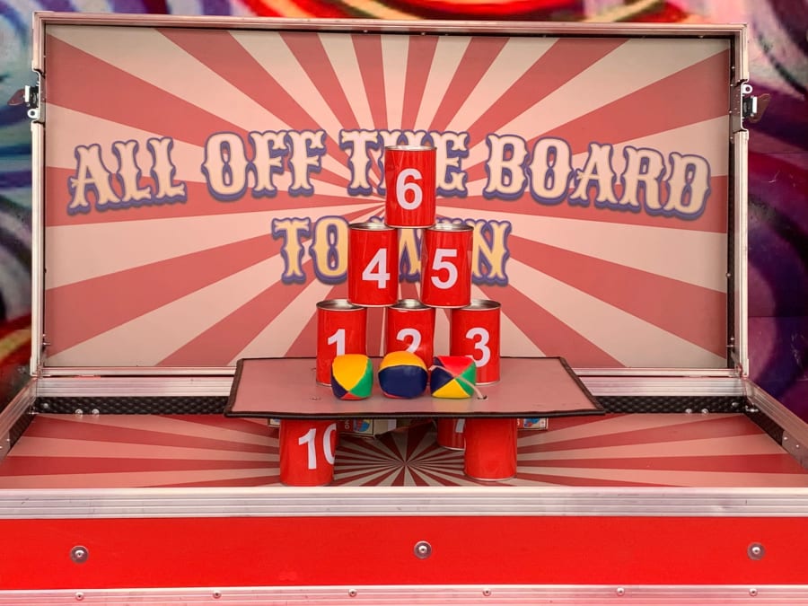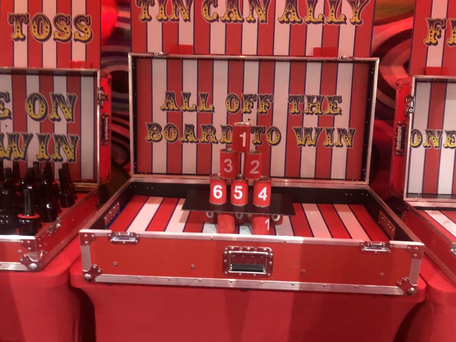 Tin Can Alley - Throw your balls to hit over the pyramid of tins. All tins need to be knocked over to claim your prize. You only get 3 balls to throw so take aim and shoot.